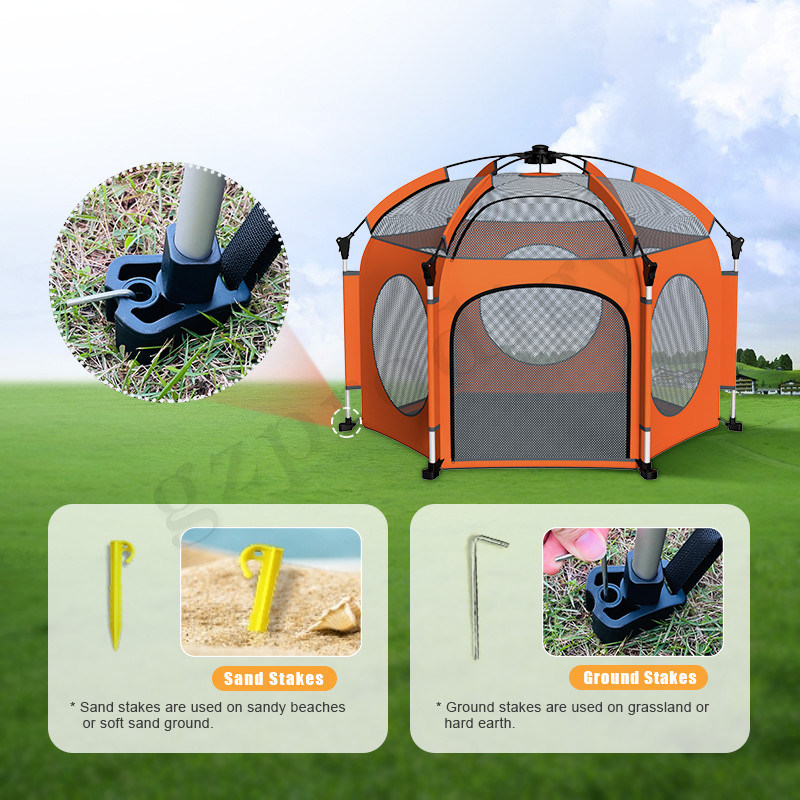 De bescherming en de zorg ontwerpen: Extra sandwich-stijl vloer met binnen schuim, zacht en comfortabel, om de baby tegen de vloerelementen te beschermen. De zachte stoffenvloer geeft het kind een zacht gevoel en is gemakkelijk schoon te maken. Een beschermende koker rond de kaderverbinding verhindert verwonding aan de vingers van de baby. Het extra schuim rond de kaderstaaf verstrekt een zachte aanraking. De grote vorm van de zeshoek is stabiel en ruim voor uw groeiend kind, dat gemakkelijk in en uit de ritssluitings U-vormige deur kan beklimmen.