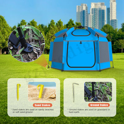 Deze multifunctionele tent heeft UV-bescherming, waterdichte bodem, ruim interieur, snelle installatie en betaalbare prijs.De tent is lichtgewicht en kan worden gevouwen in een draagbare tas om rond te dragen.